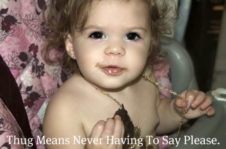 Then, proving that she learned what thug life means, she stole a cookie and ate it wearing her gold chains. Maybe SHE stole my pants!