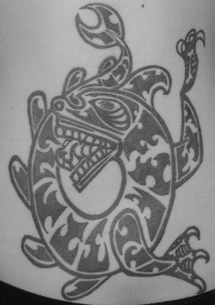 I have 7 tats – tiger on right thigh, panther on left, dragon on left shoulder back, leaping panther on right with the Southern Cross in the middle, unicorn on right breast and my sons name with a celtic knot underneath on my right arm. I long to have a large celtic knot across my lower back but haven’t found the right one yet.
